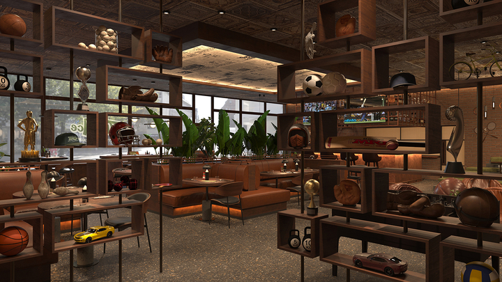 Lighting is layered to support both ambiance and functionality. Soft ambient lighting creates a welcoming backdrop, while targeted accent lighting highlights bar areas, seating clusters, and feature walls. This approach allows the interior to transition smoothly from daytime dining to high-energy evening events. Throughout the space, sports references are introduced with restraint through curated graphics, memorabilia, and interactive features, resulting in an interior that feels vibrant, sociable, and thoughtfully designed.