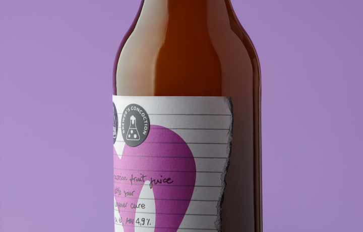 The idea of this experimental series is to brew a small batch of 'one time only' master brewer's beers. We called the edition 'Brewer's concoction' and design it as a torn out paper, from a brewer's notebook, with the ingredients and main characteristics of the 'batch' written on it. The only 'designed' element on the label is an illustration, and a beer name 'stamped' over the torn out paper.