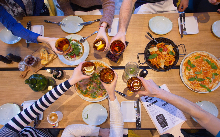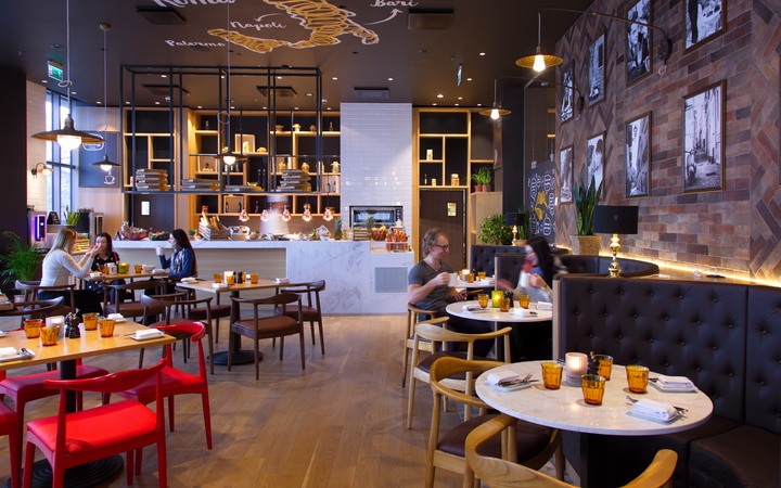 Reinterpreted elements of a typical Italian restaurant are visible throughout the space with a range of decorative items and vintage lighting features reinforcing the modern reinterpretation of a classical Italian feel.