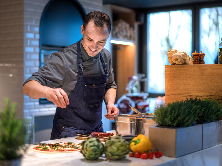 The Italian culture of food is the main attraction of the restaurant. The platforms are a Show kitchen and a Show bar, on opposite sides of the restaurant, where the distance between service and person being served is removed. The customers can enjoy views of theatrical preparation of simple delicious food and typical Italian drinks and even participate in the show while preparing their own pizza.