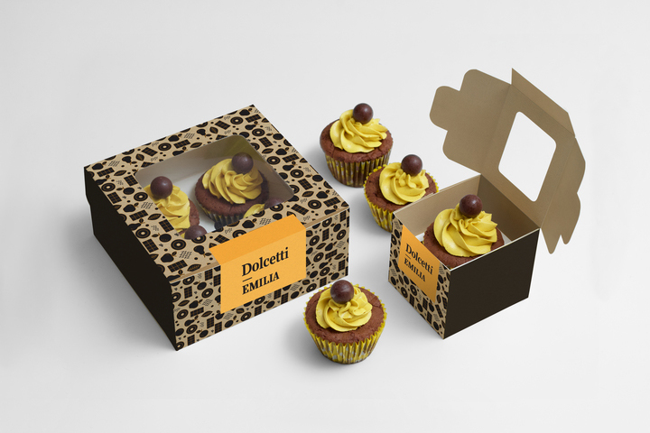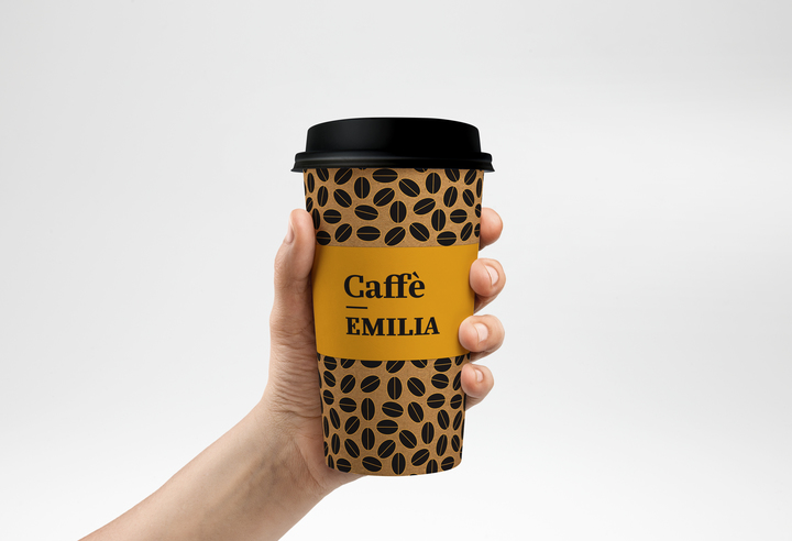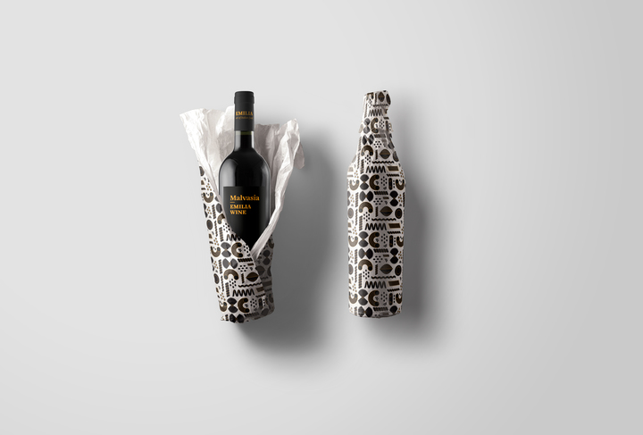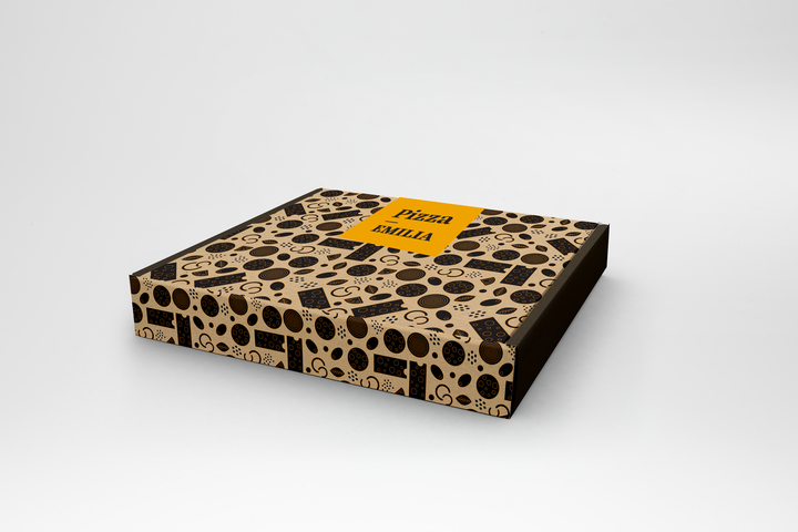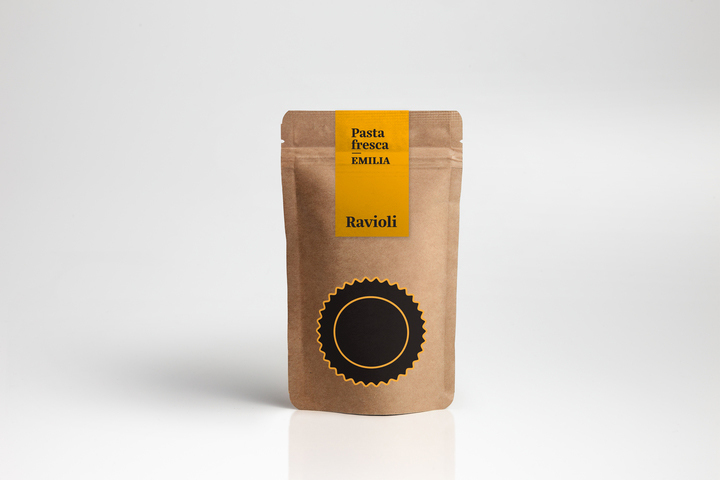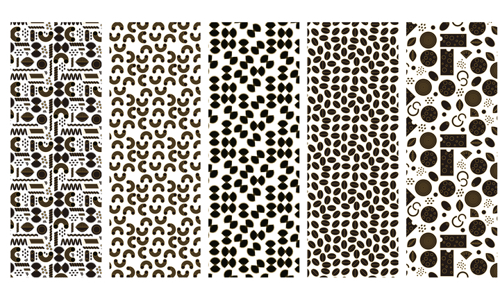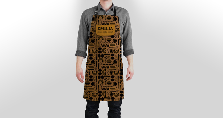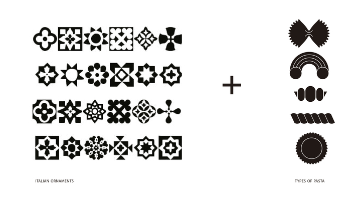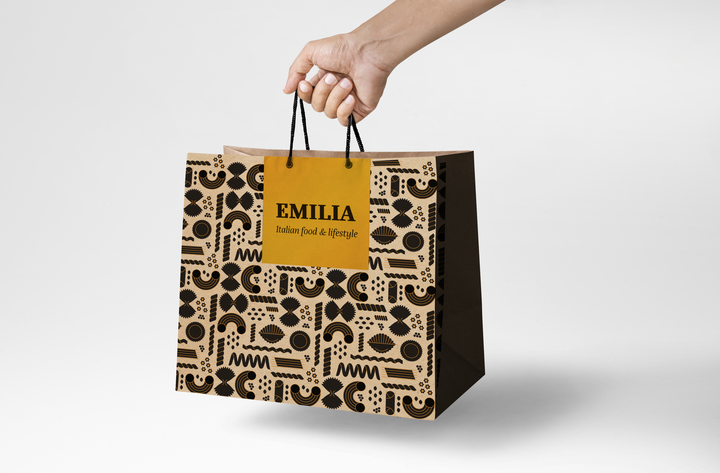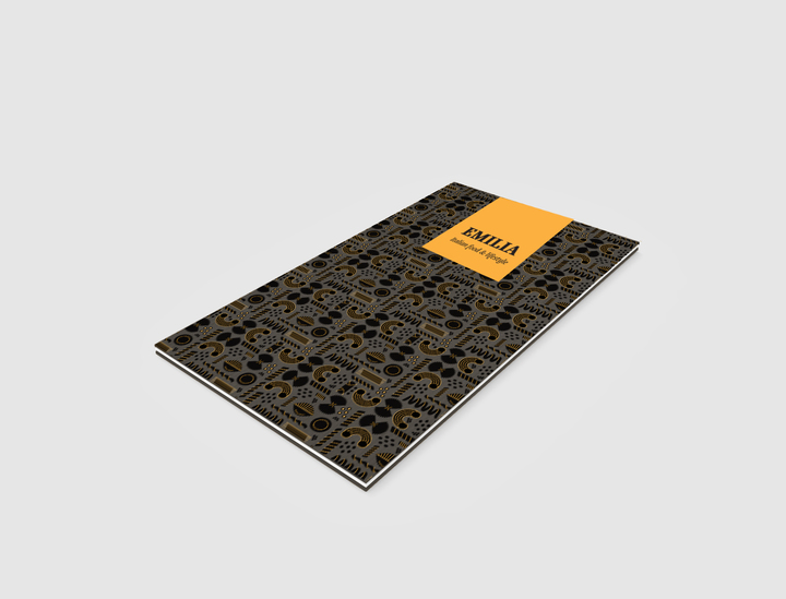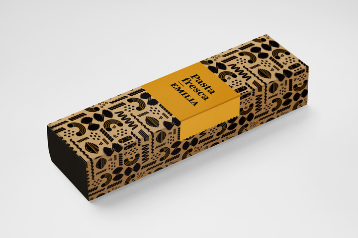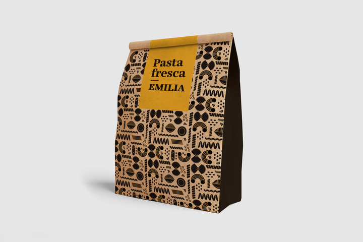 Pasta in different shapes and sizes has been choosen as a typical Italian motif for Emilia restaurants, graphically multiplied to create a pattern. The colours are golden yellow and black, evoking at the same time the shining southern light, historic ornaments and high class products of Emilia Romagna region.