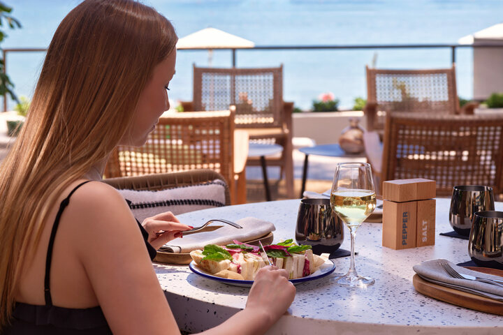 The design is a careful combination of local traditional and contemporary materials, created with the idea of a perfect place to relax by the pool and the sea, so visitors have a feeling of pleasant luxury. The spacious area of this bar, freely available to hotel guests and locals in evening hours, call to revel, explore Mediterranean flavours and soak up the laid-back vibes.