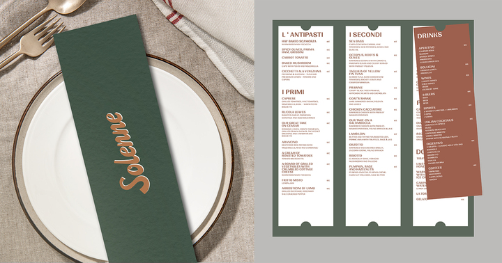 The result is a visual identity that feels honest, timeless, and distinctly Italian, one that supports Solenne’s interior design and culinary concept while creating a strong, recognizable brand presence grounded in tradition and designed for contemporary dining.