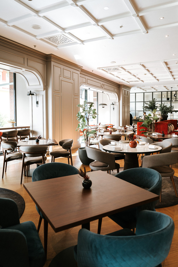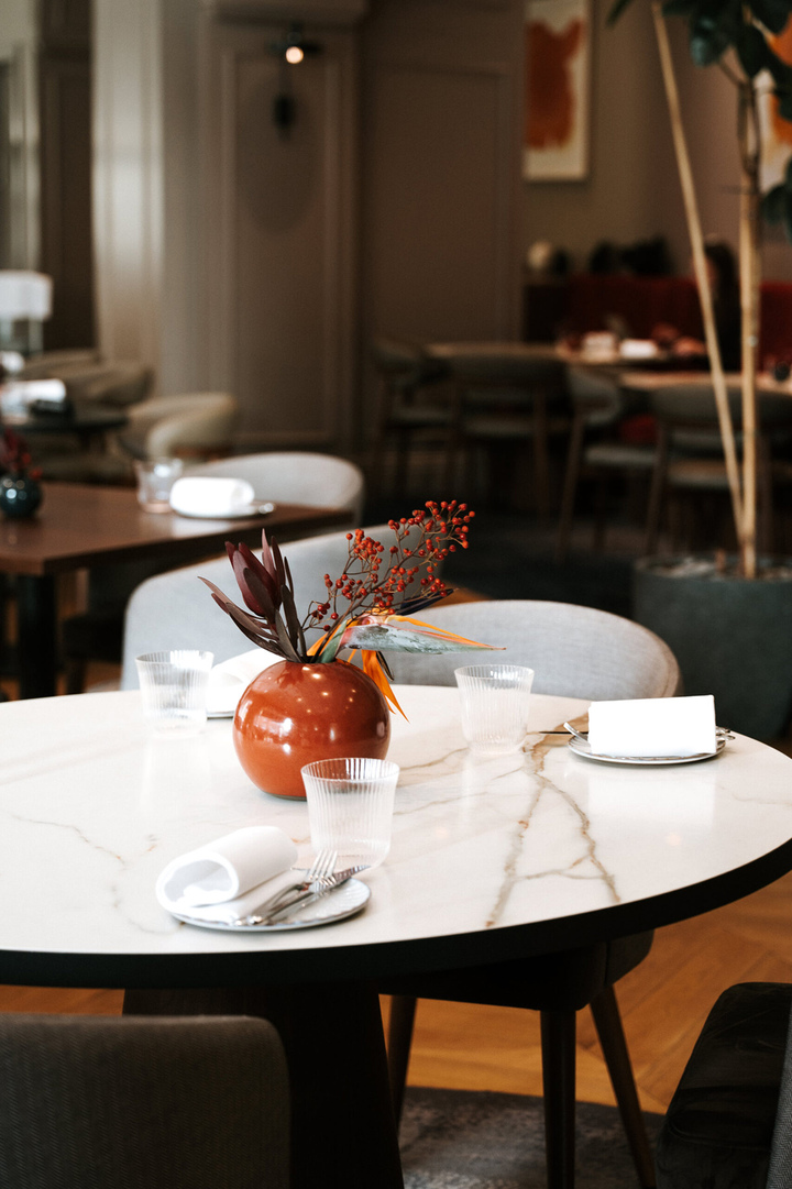 A warm, neutral palette of natural wood, stone-like finishes, soft textiles, and leather creates a calm and inviting setting. An open layout with thoughtfully arranged seating subtly defines zones while maintaining visual continuity and privacy. Comfortable banquettes, upholstered chairs, and custom tables encourage relaxed dining and reinforce a sense of quality. Layered lighting shapes a warm atmosphere that transitions effortlessly from day to night.